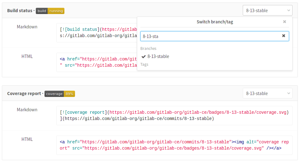 In the pipelines settings page you can find build status and test coverage badges for your project. The latest successful pipeline will be used to read the build status and test coverage values.